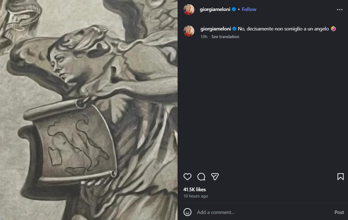 La Repubblica placed the story on its front page, pointing to before and after images that showed the angel, once a "generic cherub", bearing what it described as a clear likeness to Meloni.