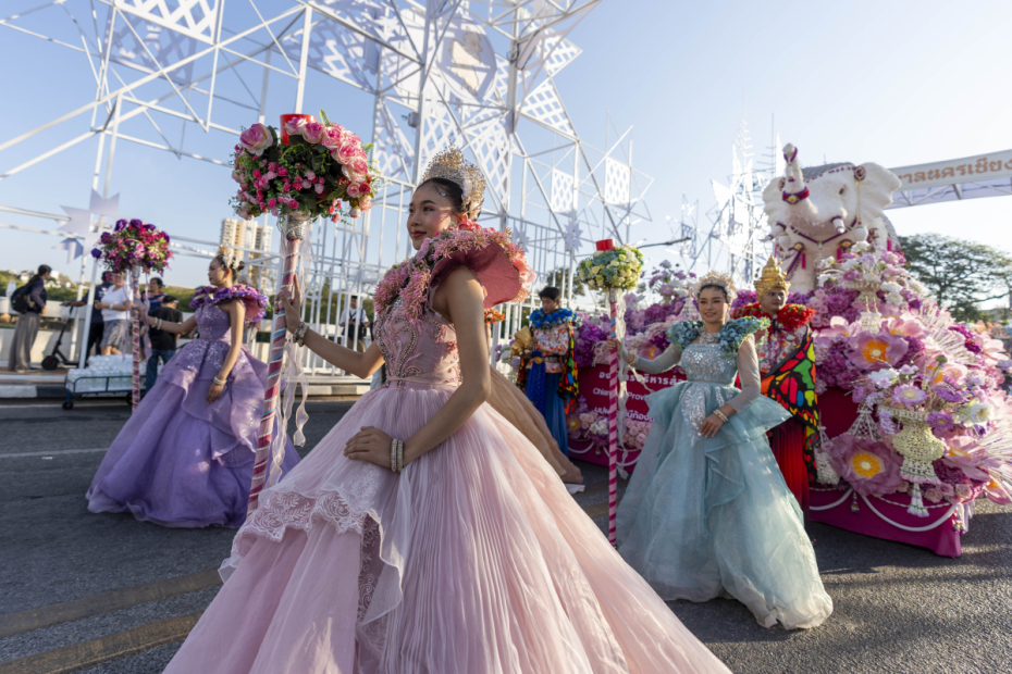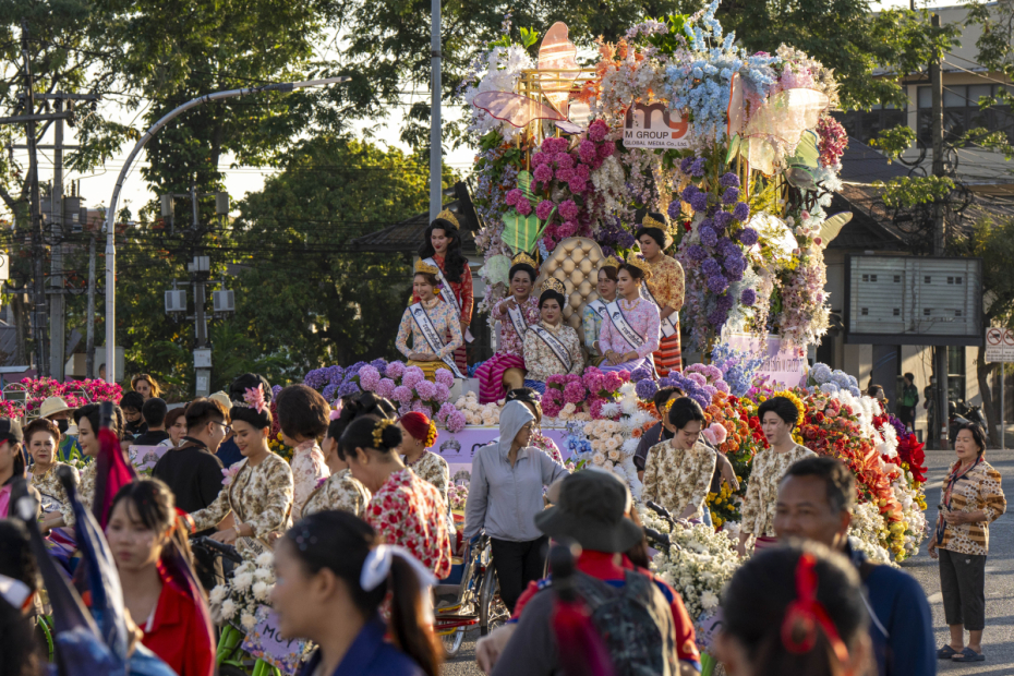 The highlight, a floral parade along Nawarat Bridge, took place on Valentine’s Day morning, featuring elaborately decorated floats, performers in traditional Lanna dress, and city-wide decorations.