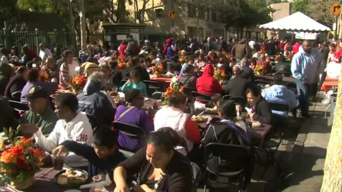 Erik Grant, the Mission’s executive chef, who was once homeless, shared the memorable task of preparing the feast: "So the expectancy is between 1,500 and 4,000 and so I've prepared 180 gallons of gravy, 3,600 pounds of turkey, 1,000 pounds of macaroni, 1,000 pounds of Collard greens, and 1,000 pounds of stuffing."