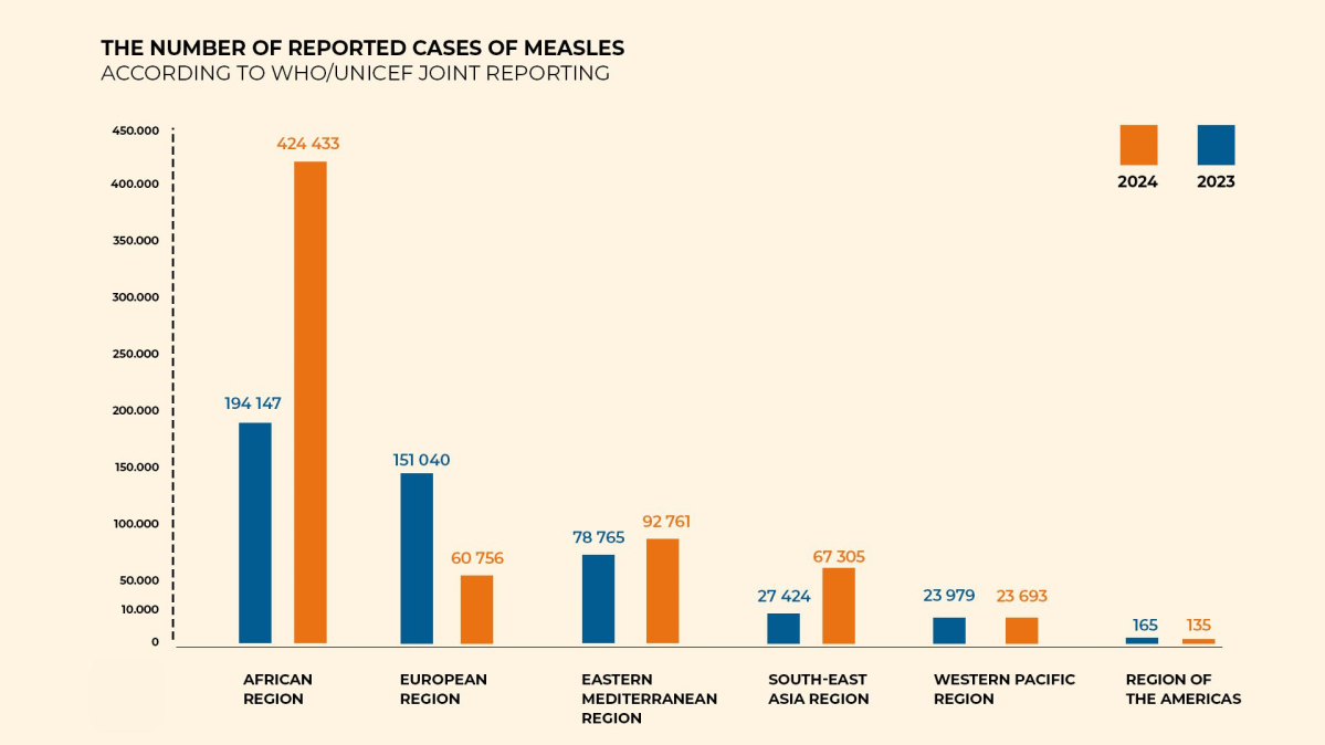 In the South Caucasus, Armenia reported 561 measles cases in 2024, slightly higher than 554 in 2023. Azerbaijan recorded 18,584 cases in 2024, up from 13,207 a year earlier, while Georgia reported 350 cases in 2024 compared to 39 in 2023.