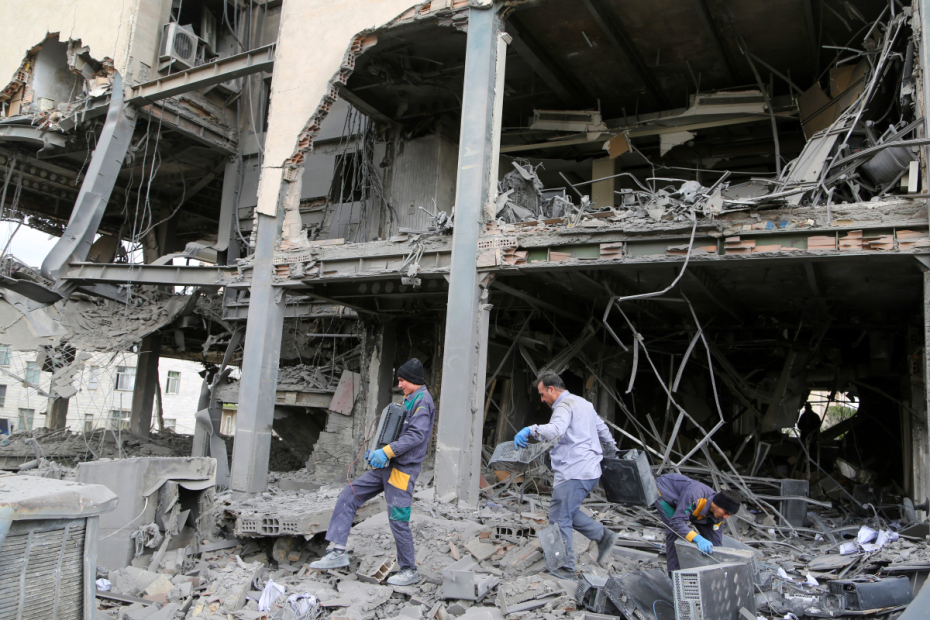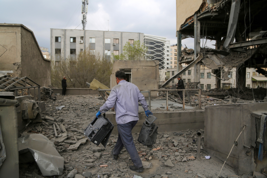 Photos show search and rescue teams at the site of the Al Araby television building in Tehran, which was struck by a U.S.-Israeli air strike on Sunday.