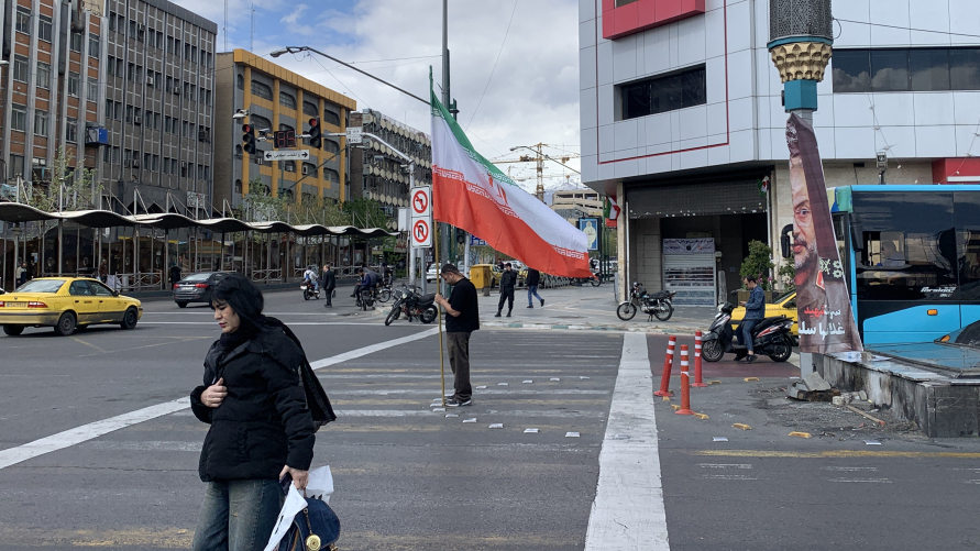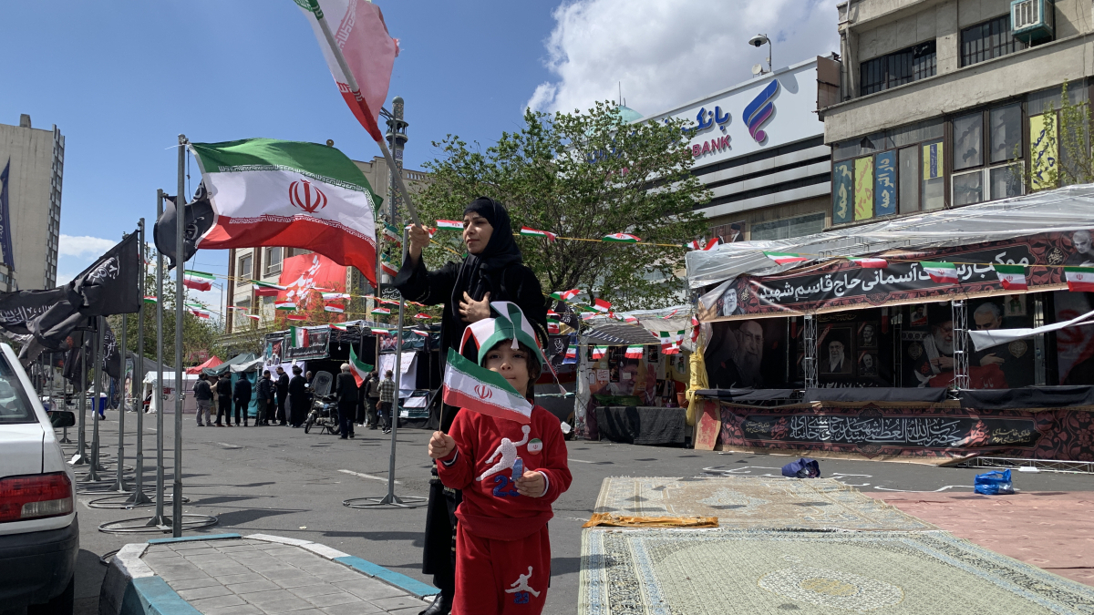 Iranians, including a woman and a young child, are seen waving the flag of the country in Tehran.