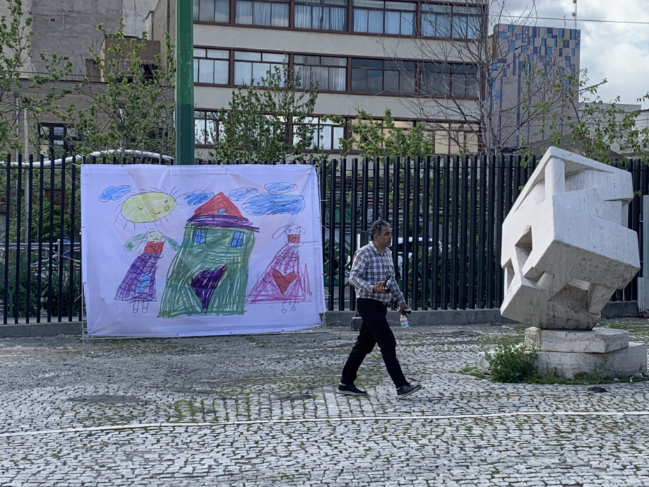 Iranian tar player sets up outside Tehran power plant