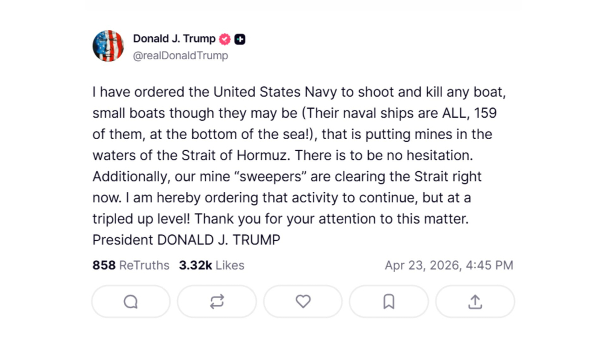 U.S. President Donald Trump said on Thursday he had ordered the U.S. Navy to “shoot and kill any boat” laying mines in the Strait of Hormuz, adding that U.S. minesweepers are operating at a “tripled” level to clear the waters.