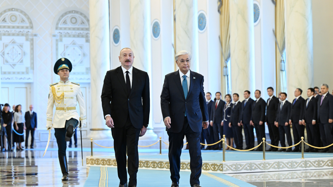 Azerbaijani President Ilham Aliyev was formally welcomed in Astana on Tuesday during an official ceremony at Kazakhstan’s presidential palace.