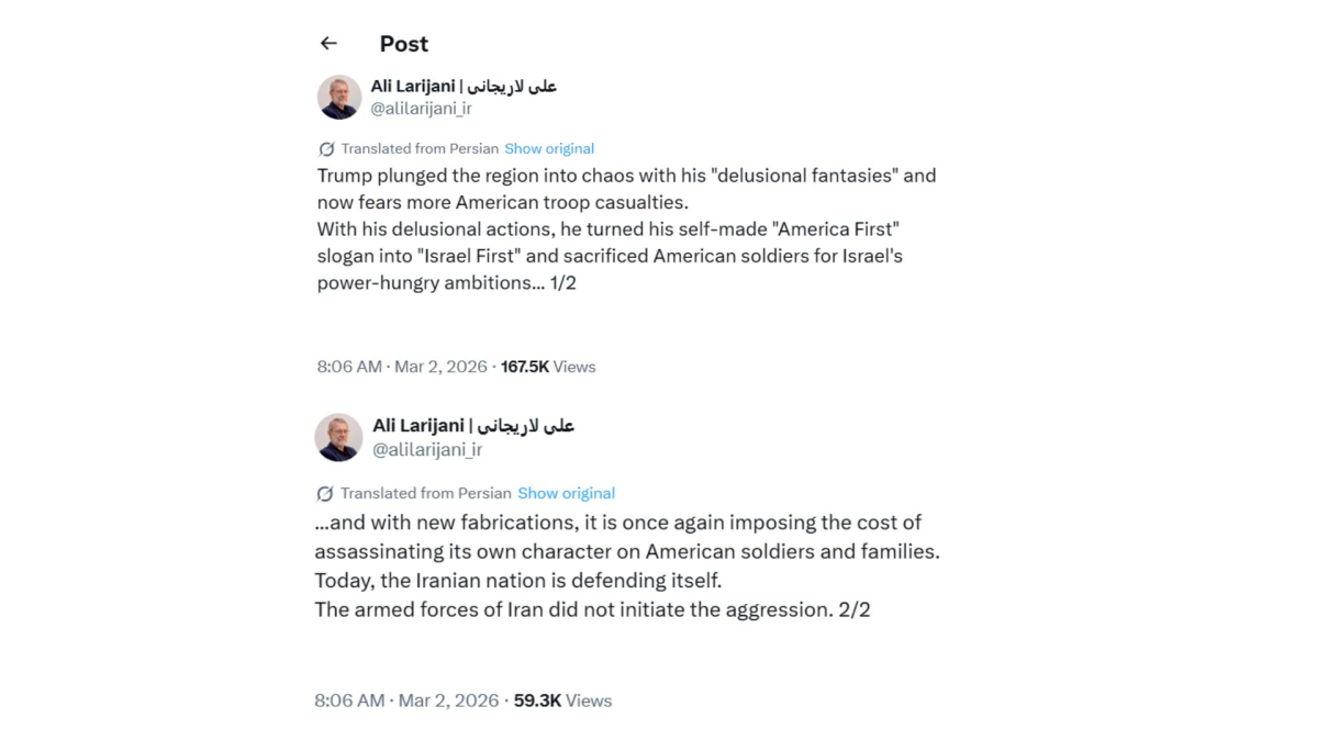 Larijani, who leads Iran’s Supreme National Security Council and has been involved in past diplomatic contacts, made the comment on the X platform.
