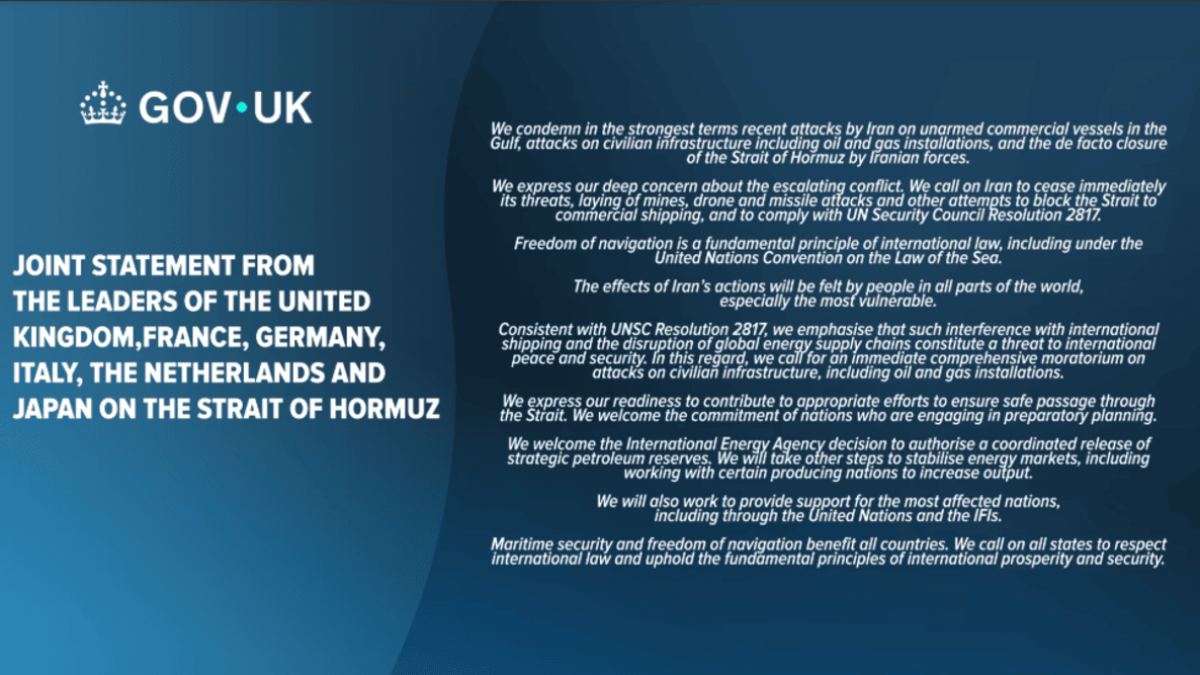 The leaders of the United Kingdom, France, Germany, Italy, the Netherlands and Japan have said the following on the Strait of Hormuz.