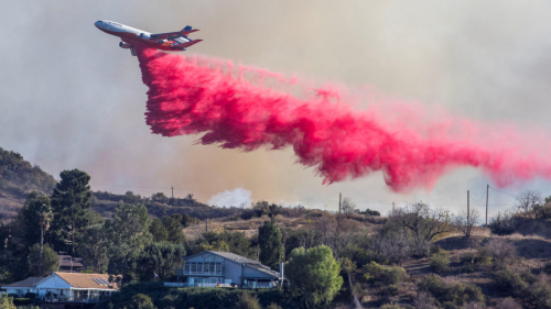Aircraft dropped water and fire retardant on steep hills to combat the Palisades wildfire in Los Angeles as winds up to 70 mph threatened to worsen the situation.