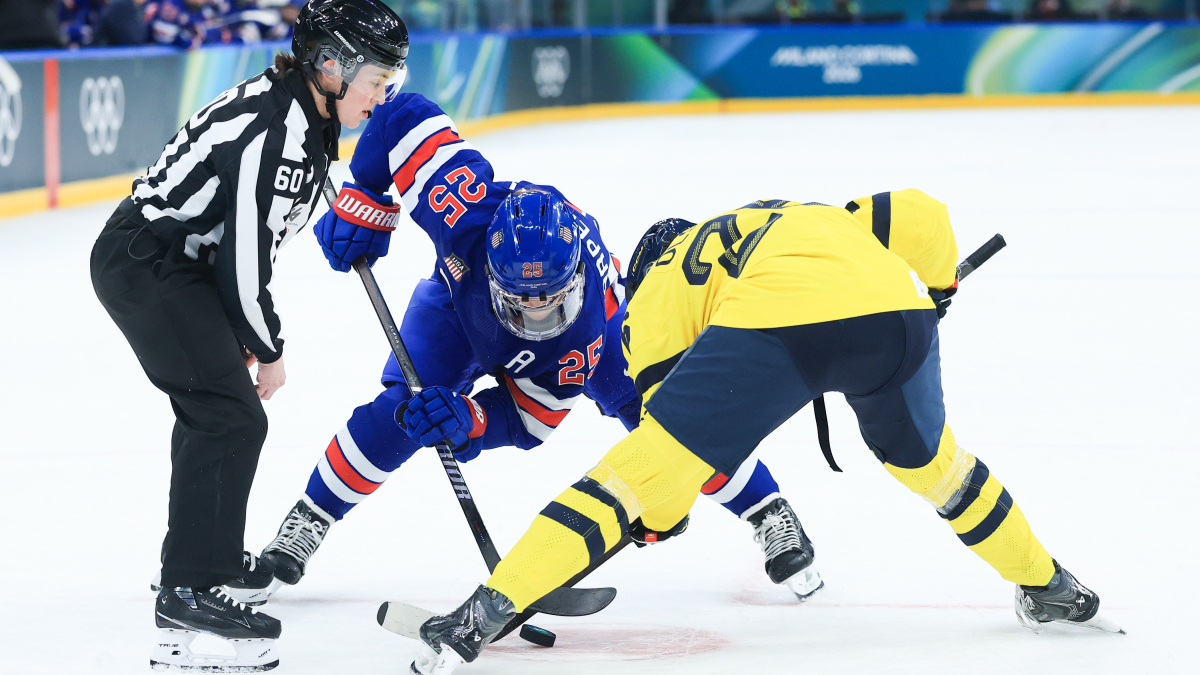 Alex Carpenter of the United States and Hanna Olsson of Sweden squared off in a women’s ice hockey semifinal face-off.