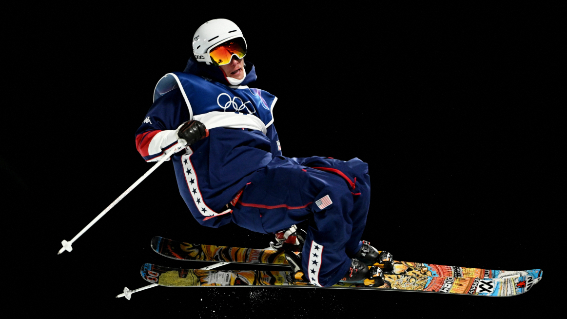 Henry Sildaru of Estonia launched into his first run of the men’s freeski halfpipe final at Livigno Snow Park.