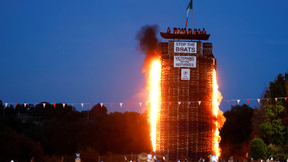 The display featured eight figures wearing life jackets in a model boat, placed on top of a massive bonfire built from more than 50 wooden pallets. Alongside the boat were banners reading "Stop the Boats" and "Veterans before Refugees," and an Irish flag.