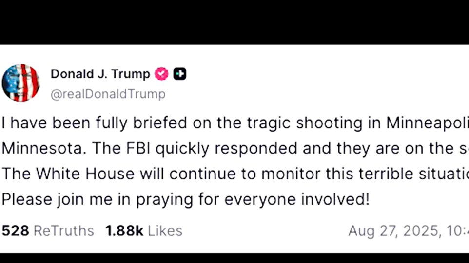 President Donald Trump posted a few minutes ago on Truthsocial account saying that he has been fully briefed about the shooting in Minneapolis.