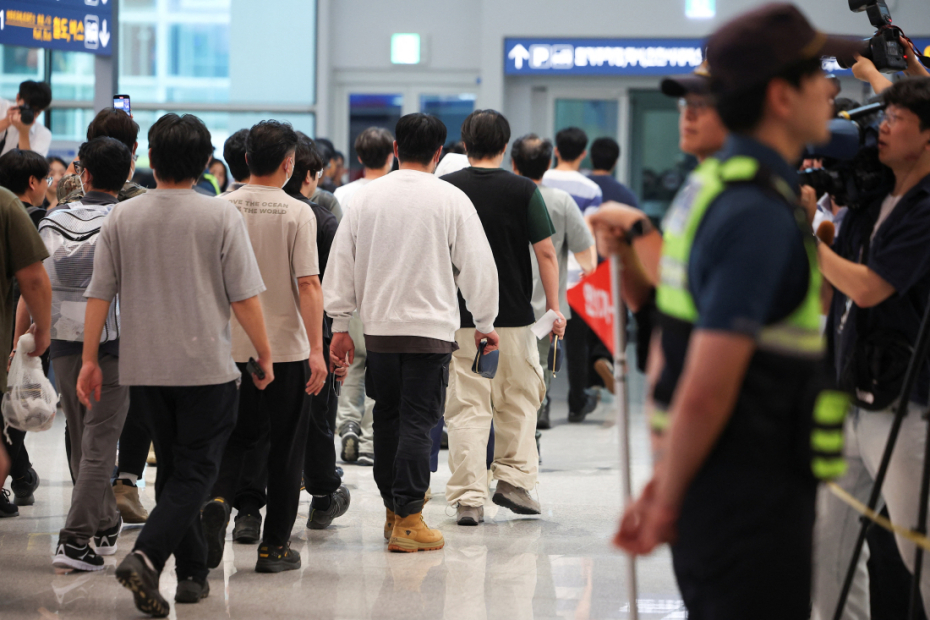 Around 300 South Korean workers returned home on Friday, one week after being detained in a large-scale U.S. immigration raid at a battery project site in Georgia.