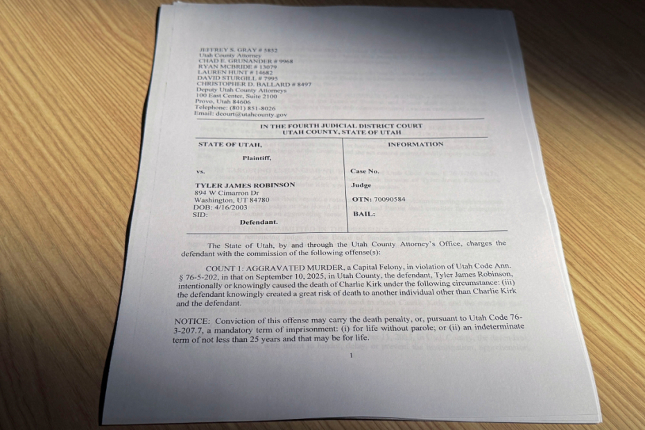 Prosecutors have added aggravating factors to the murder and firearm charges because Robinson is believed to have targeted Kirk based on political views and knew that children would witness the killing, Gray said. Under state law, only aggravated murder can carry the death penalty.