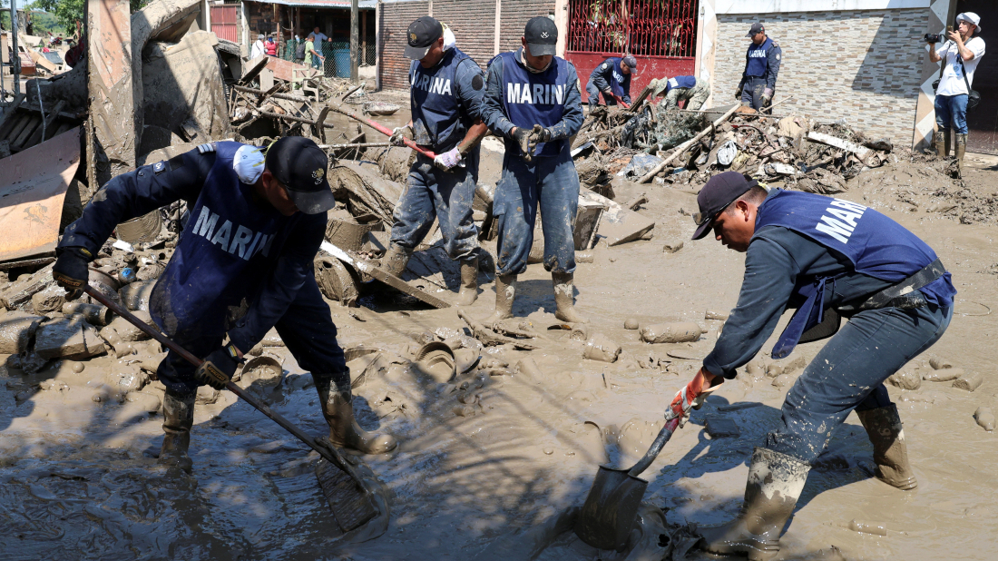 The Mexican Navy and volunteer groups have been assisting by delivering water, mattresses, and cleaning supplies. Streets remain muddy and blocked with rubble, while motorbikes and pedestrians navigate the treacherous conditions.