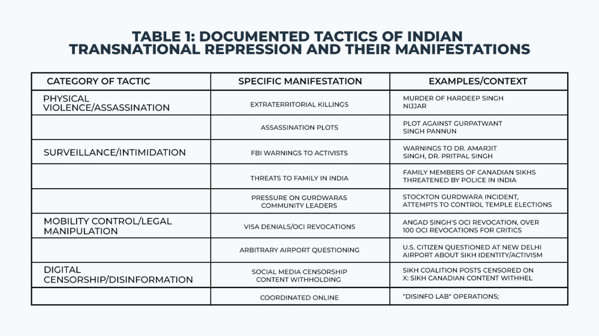 Mobility restrictions add another dimension. These include visa denials, the revocation of Overseas Citizen of India status and targeted airport questioning. Digital measures include the suppression of Sikh-related content and coordinated information operations. Taken together, these tactics indicate a structured system rather than isolated incidents.