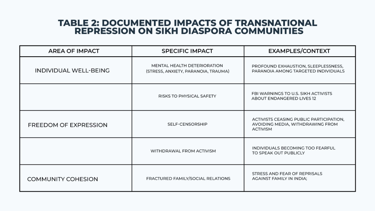 The impacts extend across individual well-being, community cohesion and democratic participation. Individuals report heightened anxiety, insomnia and a sense of vulnerability. The FBI has issued safety warnings to several Sikh activists in the United States.