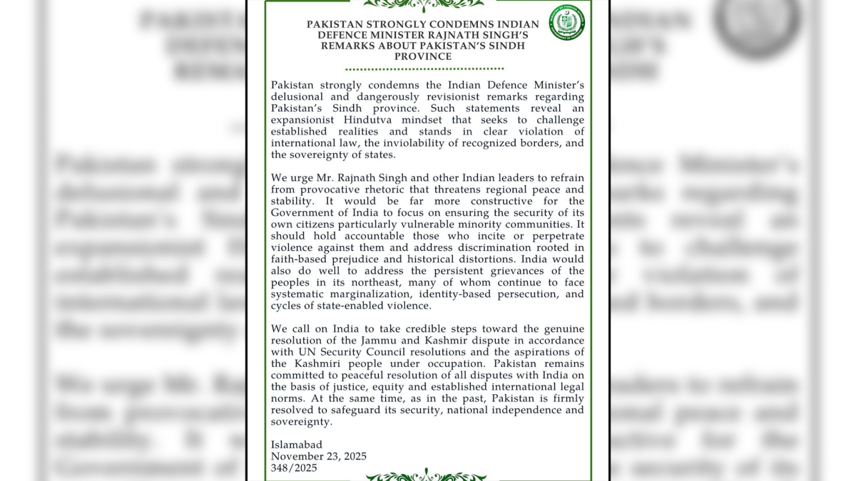 Officials said the comments reflected an expansionist Hindutva mindset and challenged recognised borders under international law. Islamabad warned that such rhetoric threatens regional peace and stability.