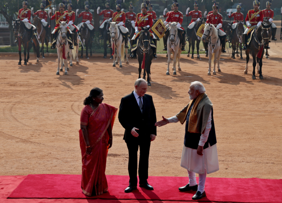 On Friday, Putin was given a ceremonial welcome on the forecourt of Rashtrapati Bhavan, the colonial-era presidential palace, with a 21-gun salute as his convoy drove in.