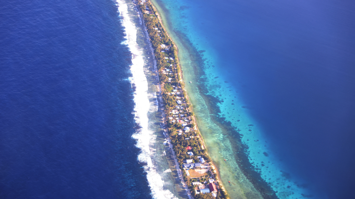 Tuvalu is among the countries most exposed to sea level rise, made up of low-lying atolls scattered across the Pacific between Australia and Hawaii. On the main atoll of Funafuti, land narrows to just metres in places, with families living under thatched roofs and children playing football on the airport runway because of space constraints.