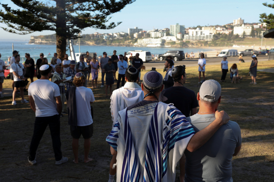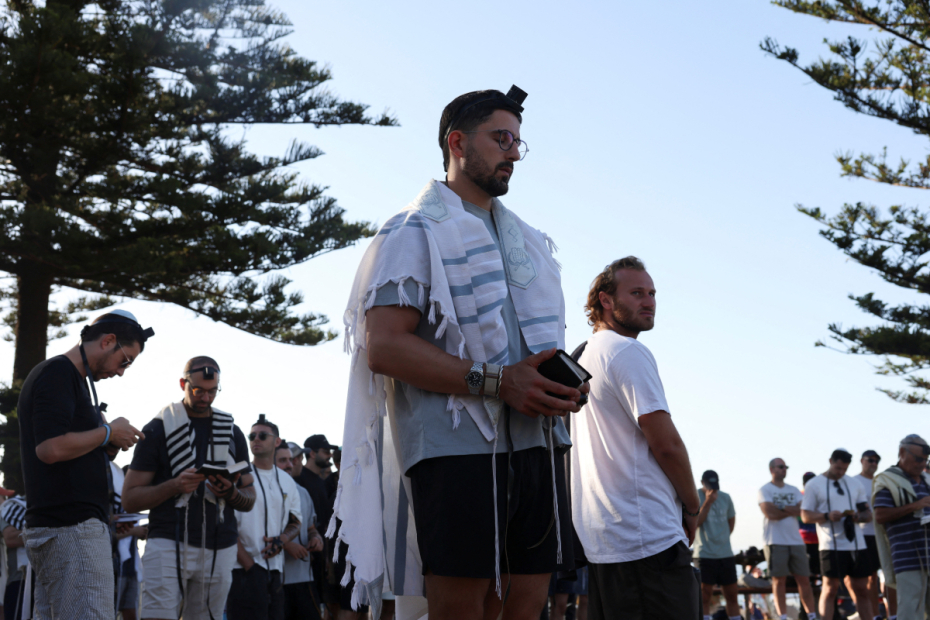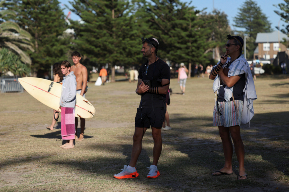 Australia’s Jewish community gathered at Bondi Beach for prayers on Friday, as hundreds of swimmers and surfers formed a large circle offshore in a show of solidarity.