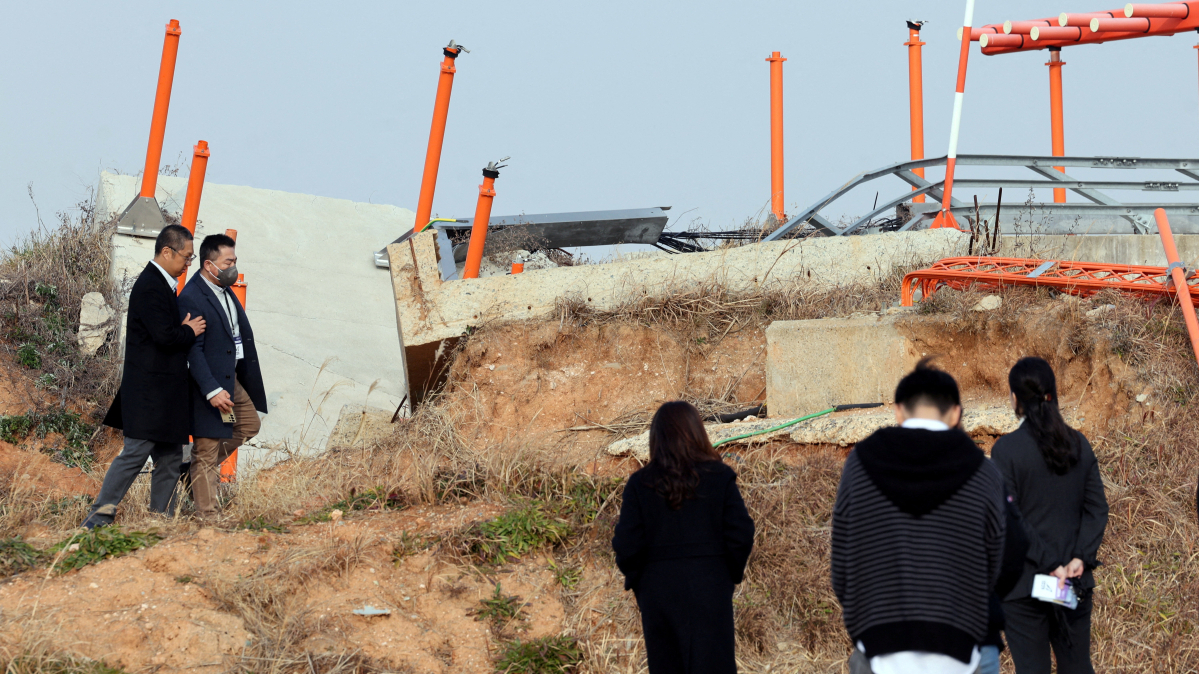 The aircraft struck the embankment during a failed landing on December 29, 2024, killing 179 of 181 people on board. After attending a memorial ceremony, bereaved families toured the damaged site, inspected pieces of the concrete structure, and placed a birthday cake for victims with December birthdays.