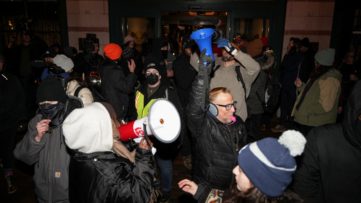 Video footage showed protesters marching with placards, fireworks exploding overhead and crowds moving through city streets before gathering outside buildings linked by activists to federal agents. Some protesters were also seen spray-painting graffiti on entrance doors.