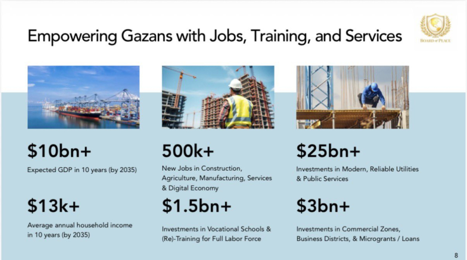 Slides at the ceremony showed dozens of skyscrapers along the coast, new housing estates in Rafah, and phased development maps for Gaza’s 2.1 million residents.