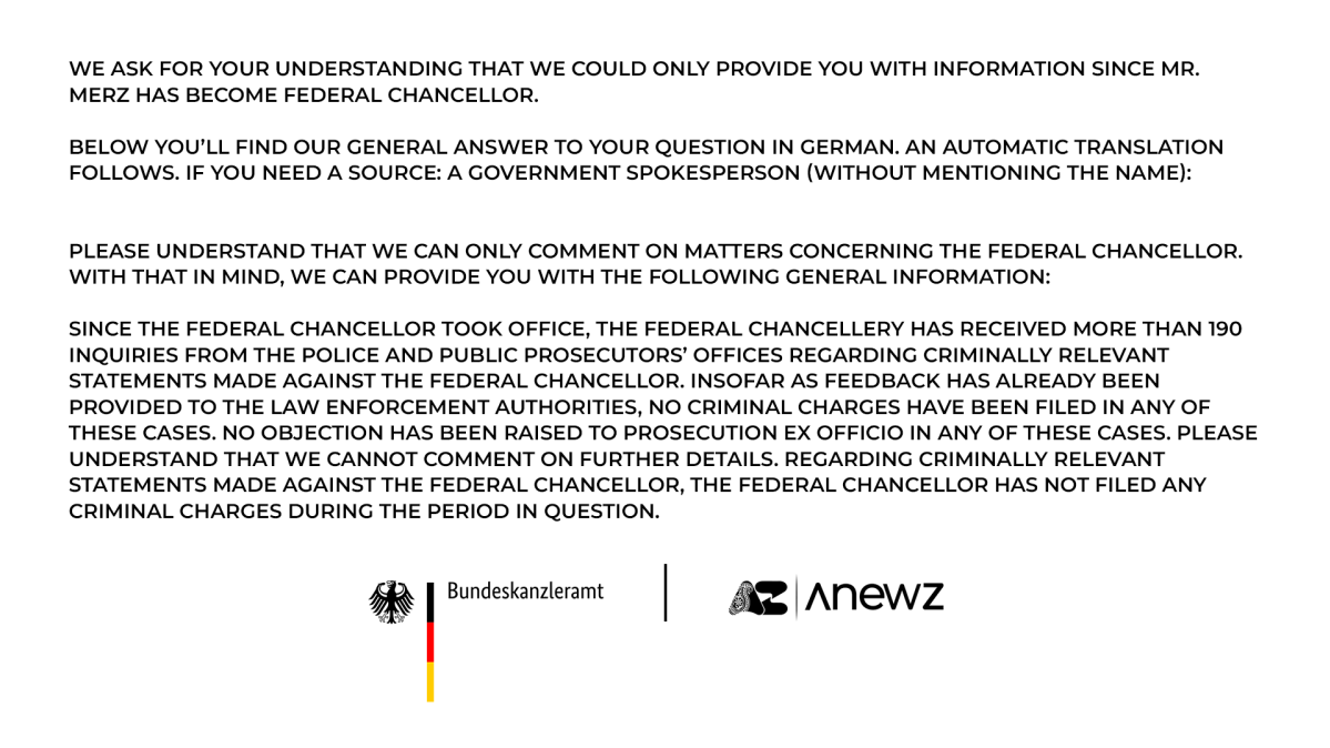 AnewZ contacted the Federal Chancellery to clarify whether the complaints described in the report were filed by Merz in a personal capacity, and to ask how the government assesses the balance between protecting individuals from abusive speech and safeguarding constitutionally protected freedom of expression.