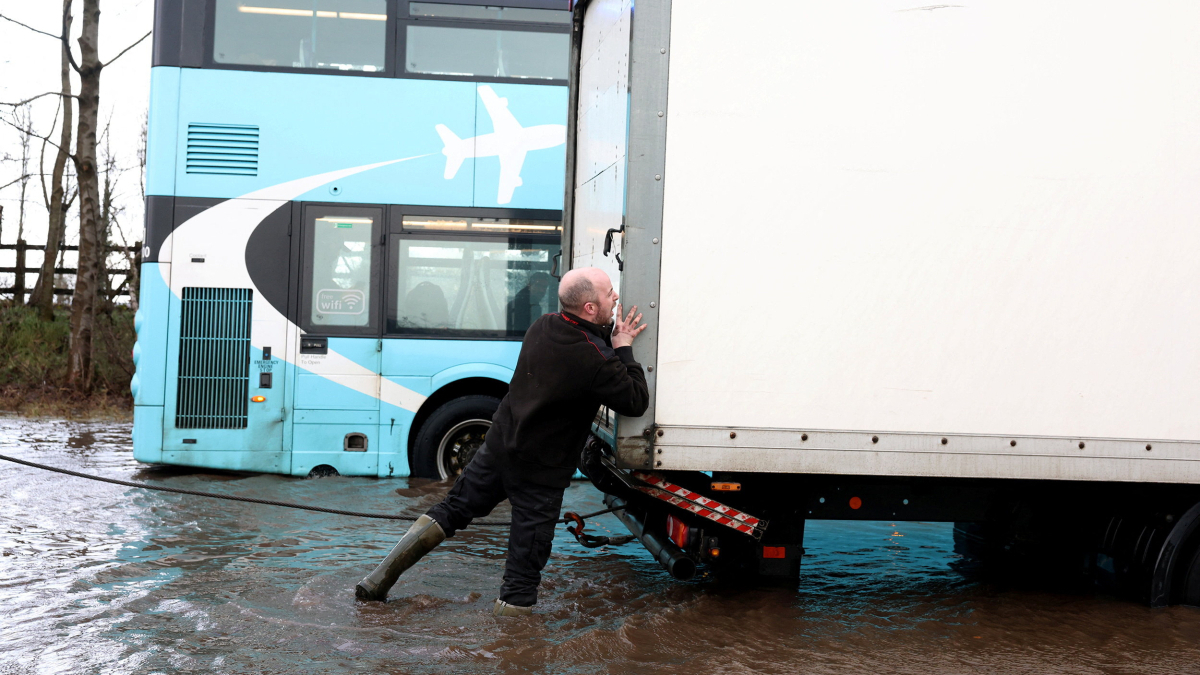 In Northern Ireland, flooding was reported across parts of County Antrim, where police were seen towing vehicles from submerged roads and clearing fallen trees.