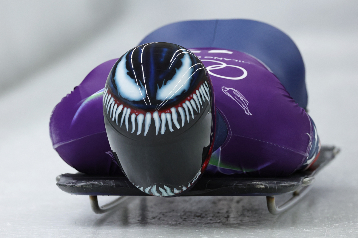At the Cortina Sliding Centre, American skeleton athlete Austin Florian drew attention during official training with a helmet designed to resemble Marvel’s Venom, adding a touch of personality to the high-speed discipline.