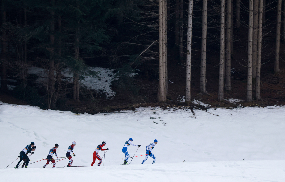 The cross-country leg of the Gundersen event offered a sweeping winter scene, with athletes racing through a snowy woodland landscape in one of the Games’ most picturesque settings.
