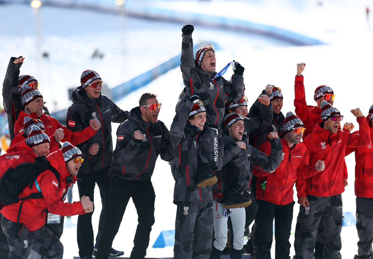 In Nordic combined, Austria’s Johannes Lamparter celebrated silver in the Individual Gundersen Normal Hill/10km event at the Tesero Cross-Country Skiing Stadium in Lago. He cheered and embraced his team on the podium during the victory ceremony.