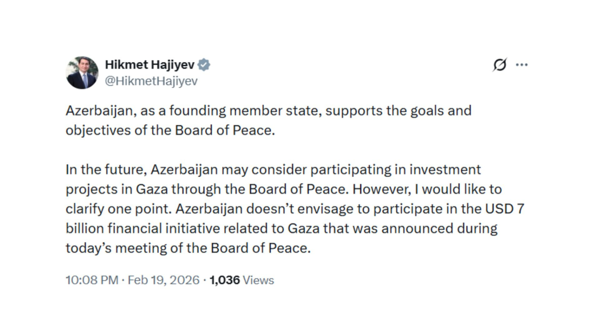 However, Assistant to the President of Azerbaijan, Hikmet Hajiyev, later confirmed, “Azerbaijan doesn’t envisage to participate in the USD 7 billion financial initiative related to Gaza that was announced during today’s meeting of the Board of Peace.”