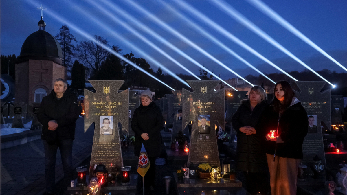 In Lviv, beams of light pierced the evening sky above the graves of Ukrainian soldiers as residents gathered at the Marsove Pole cemetery to honour those killed in the war.