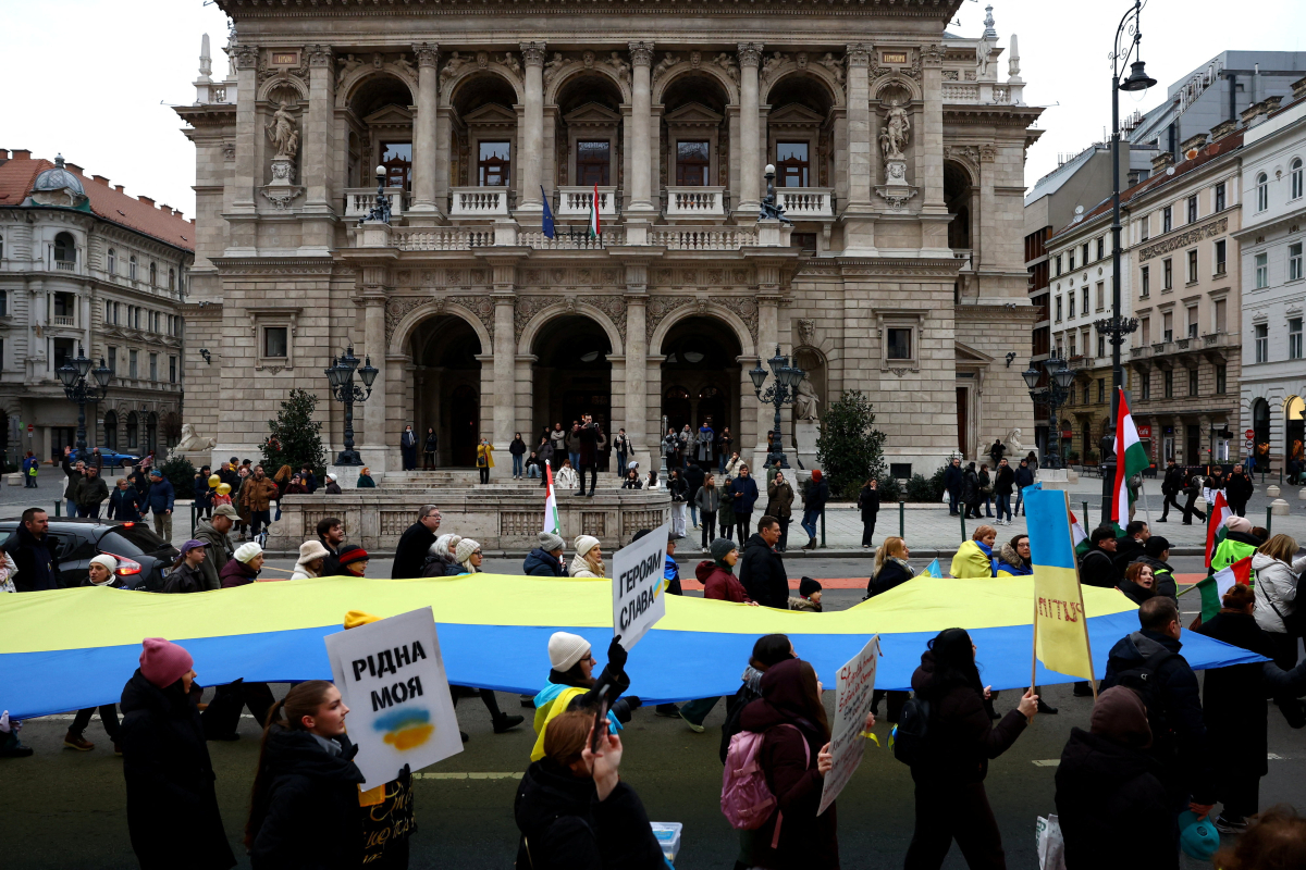 In Budapest, around a thousand Hungarians and Ukrainian expatriates marched as the issue became increasingly entangled in domestic politics ahead of Hungary’s parliamentary elections.