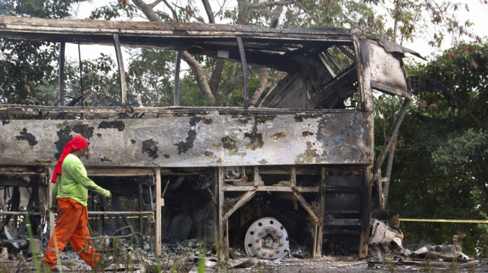 Reuters images show the bus completely burned out after it was engulfed by flames following the collision, with just the skeletal remains of the metal frame left standing.