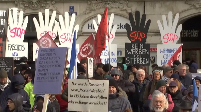 Protesters gathered outside the Munich Security Conference, opposing NATO, the arms industry, and war. The demonstrations included pro-Palestine activists and critics of weapon deliveries to Ukraine, while a counter-protest in support of Ukraine occurred nearby.