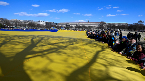 Thousands of demonstrators in the United States have unveiled the world's largest Ukrainian flag near the White House, urging President Donald Trump to support Ukraine as it continues its three-year war with Russia.