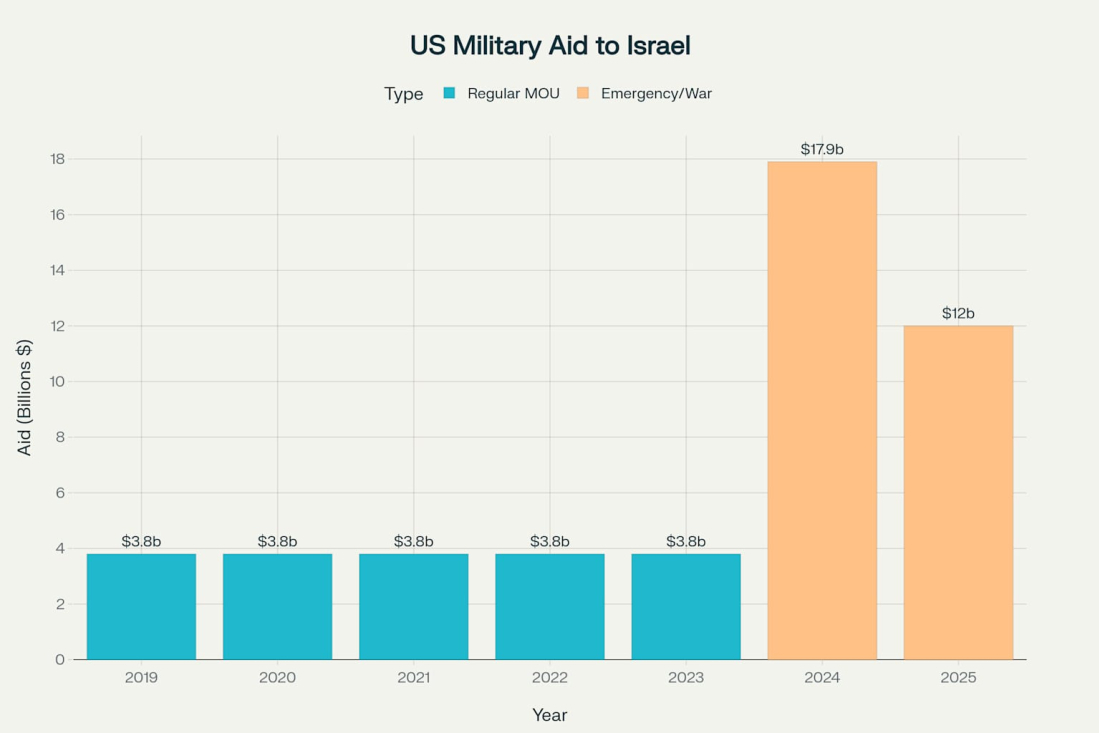 Total U.S. spending on Israel's military operations and related regional operations has reached at least $22.76 billion since October 2023. This figure substantially exceeds any previous year since the U.S. began granting military aid to Israel in 1959. The spending represents a dramatic increase from the standard $3.8 billion provided annually under the current 10-year Memorandum of Understanding.