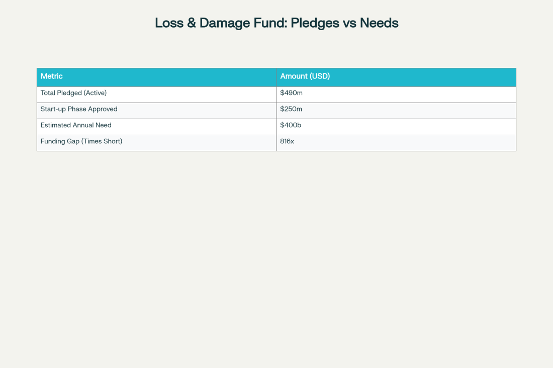 However, the funding gap remains staggering. The Loss and Damage Collaboration estimates annual needs of $400 billion, making current pledges insufficient to meet even 1% of requirements. Barbados Prime Minister Mia Mottley warned that "those who contributed to the problem, must help solve the problem," calling for taxes on flights, shipping, and fossil fuel extraction.